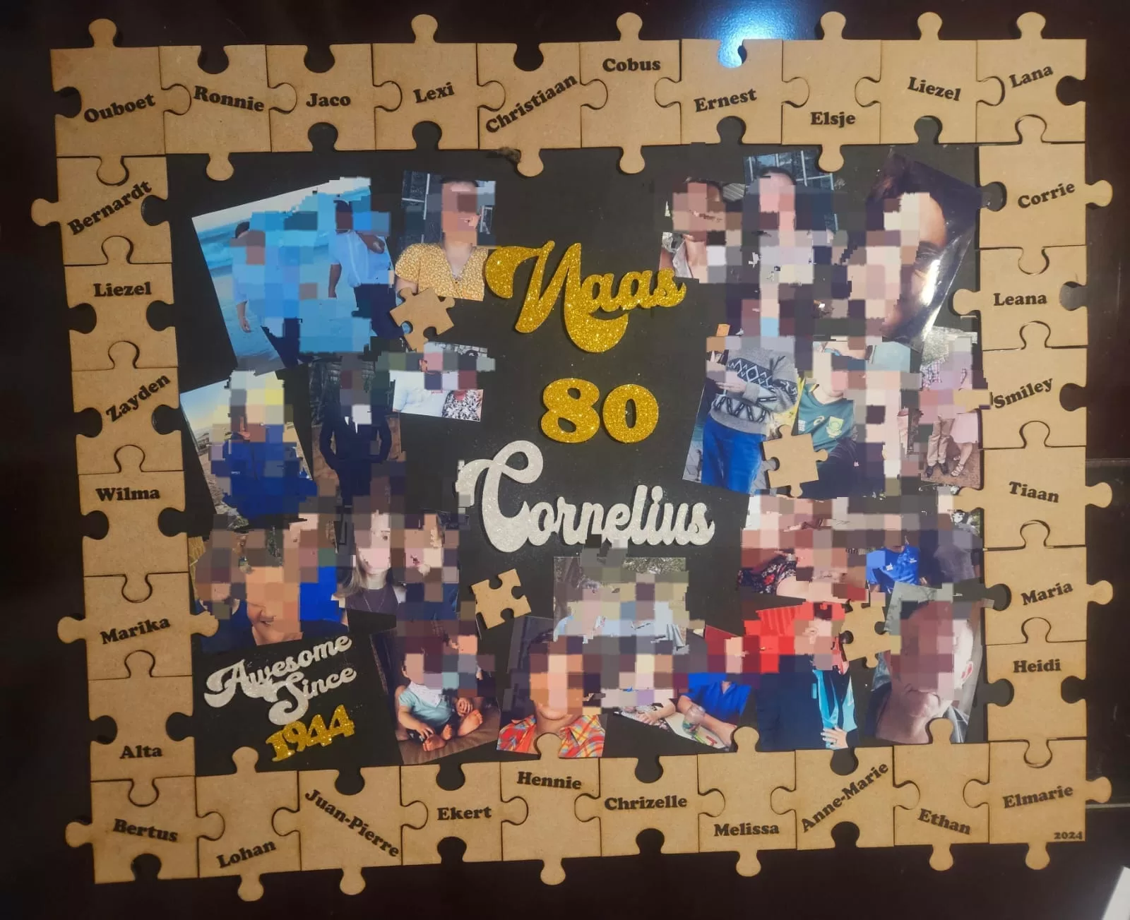 Our Large Puzzle Piece photo frame captures moments in someone special?s live to display the family of Naas Cornelius when he turned 80.